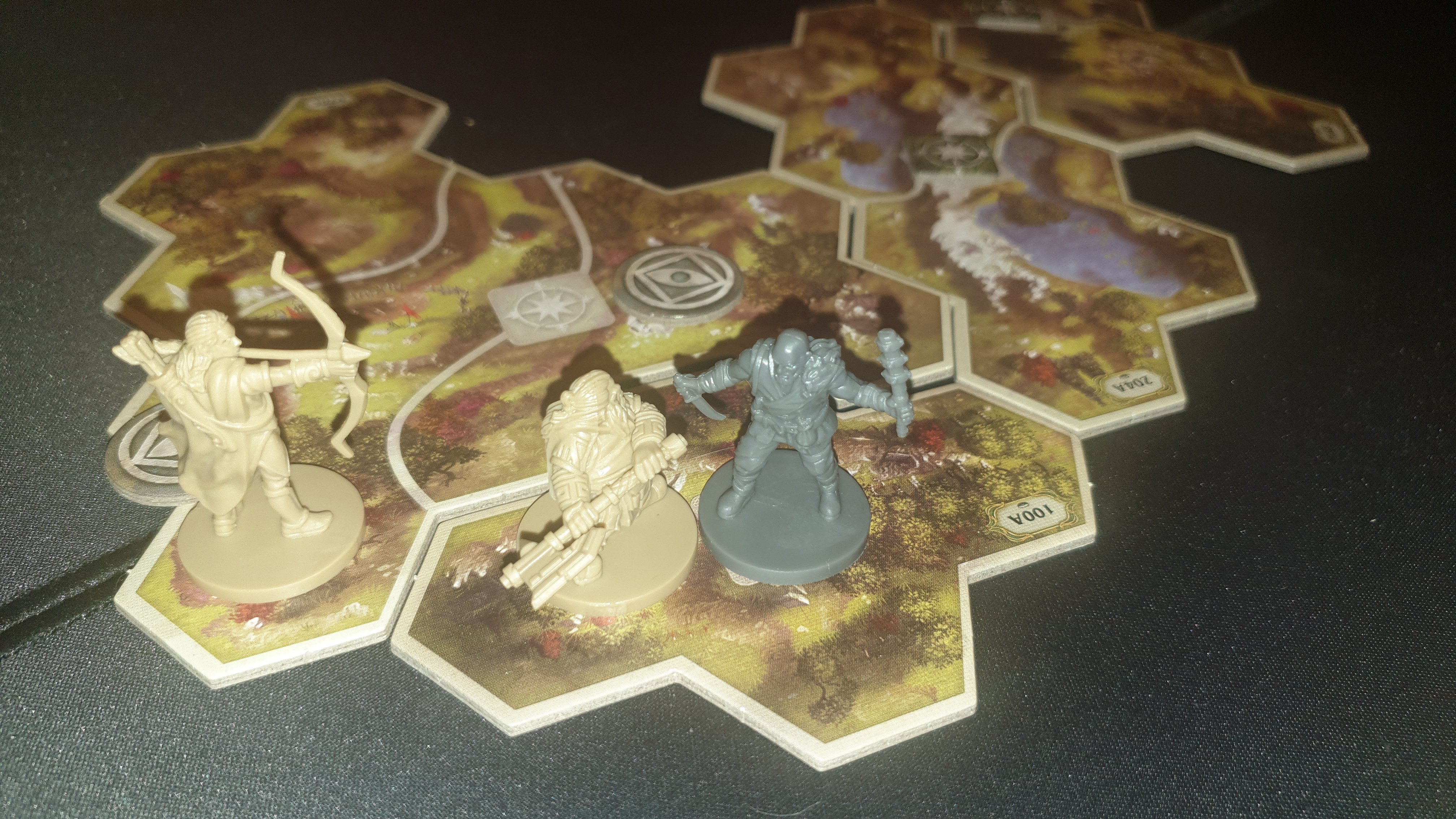 Kolejnym dobrodziejstwem jest mapa i jej rozmieszczenie. Jeśli uprzednio graliście w Posiadłość czy Descent (czy jakąkolwiek grę eksploracyjną), pewnie co najmniej raz pożarła Was frustracja, kiedy trzeba przeorganizować stół w połowie rozgrywki,bo nowy kafelek mapy się nie mieści. Podróże naprawiają ten problem prostym sposobem – mgła. Aplikacja od początku pokazuje nam jak duża będzie mapa, i w którą stronę będzie się rozrastać, jednocześnie nic nie spojlując. Brawo FFG!