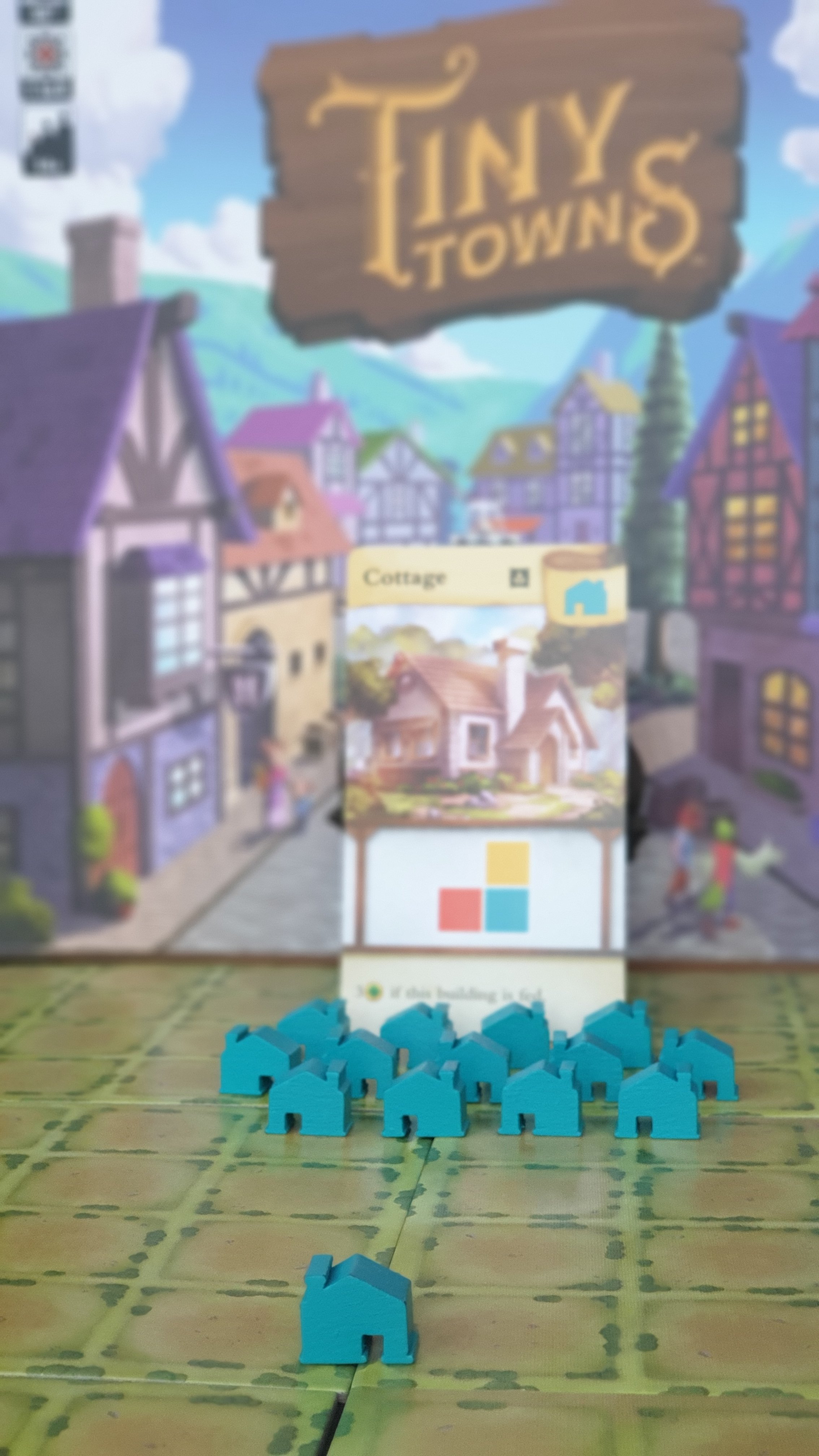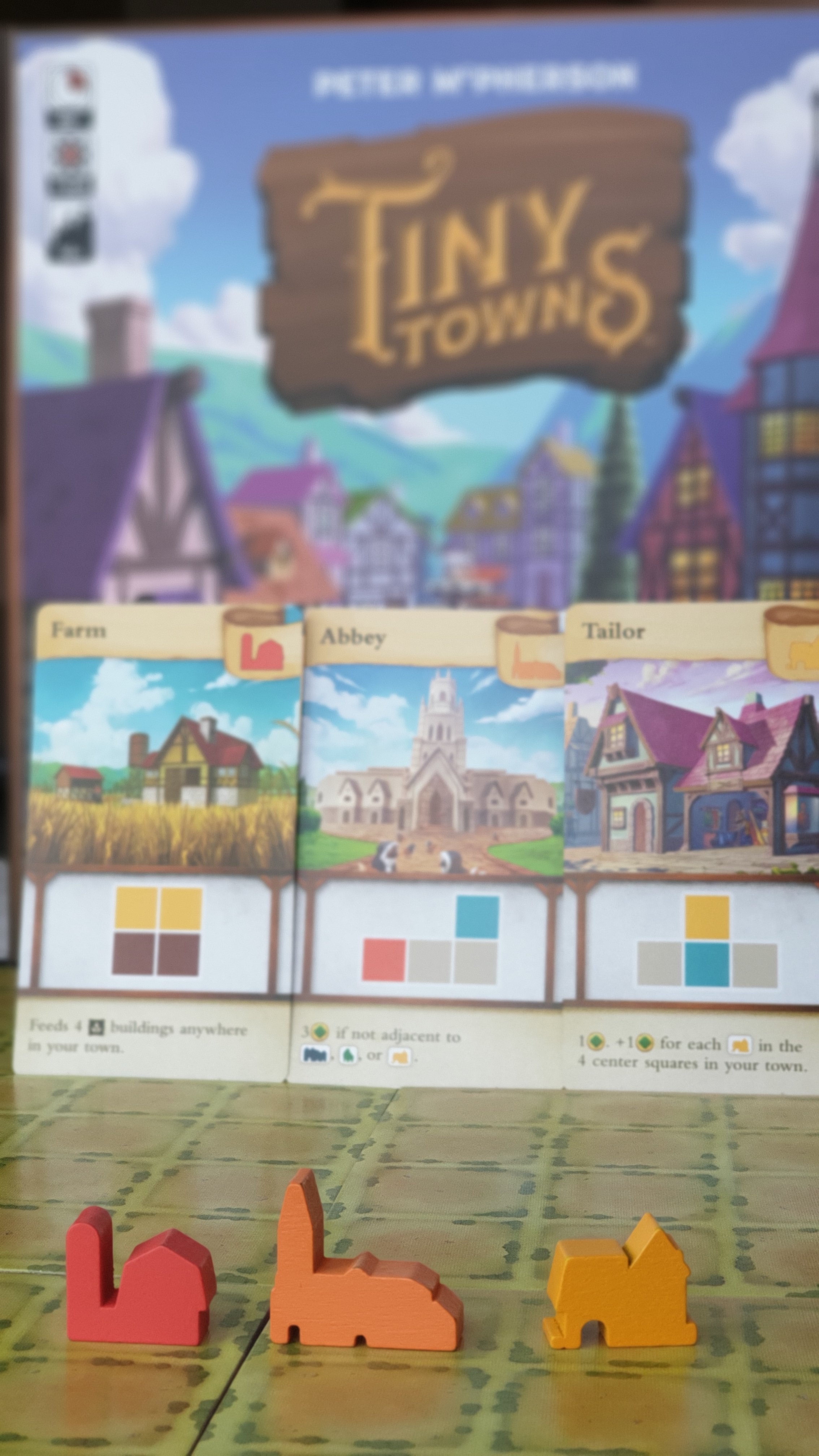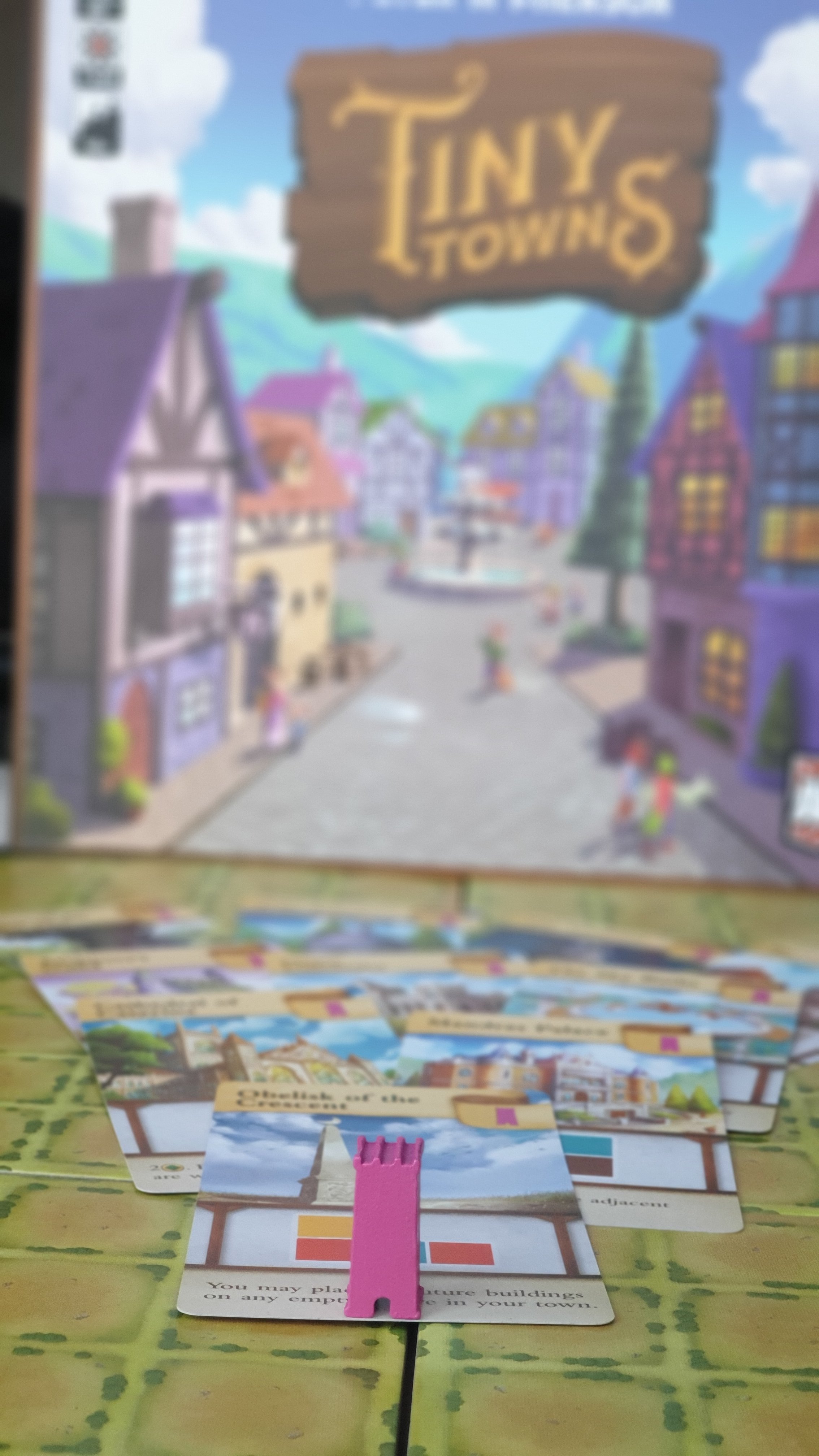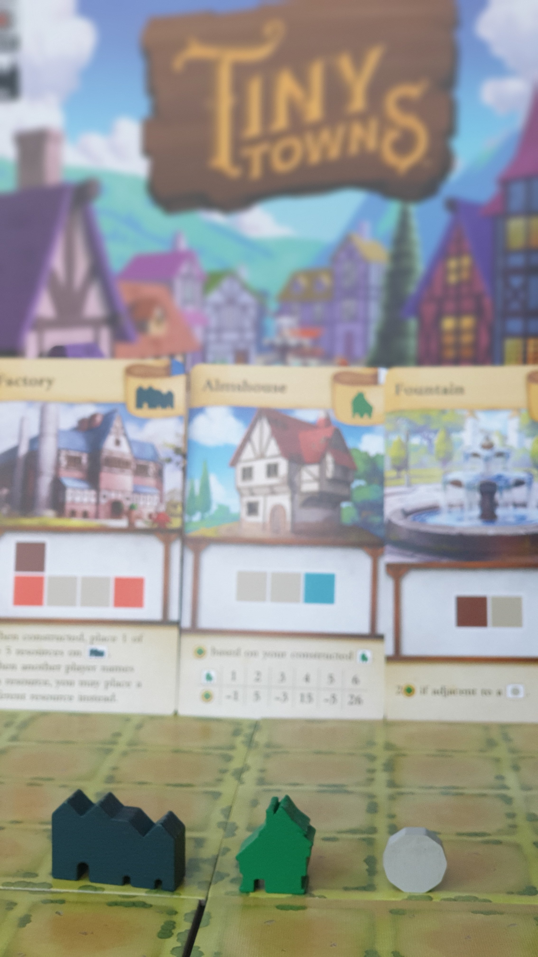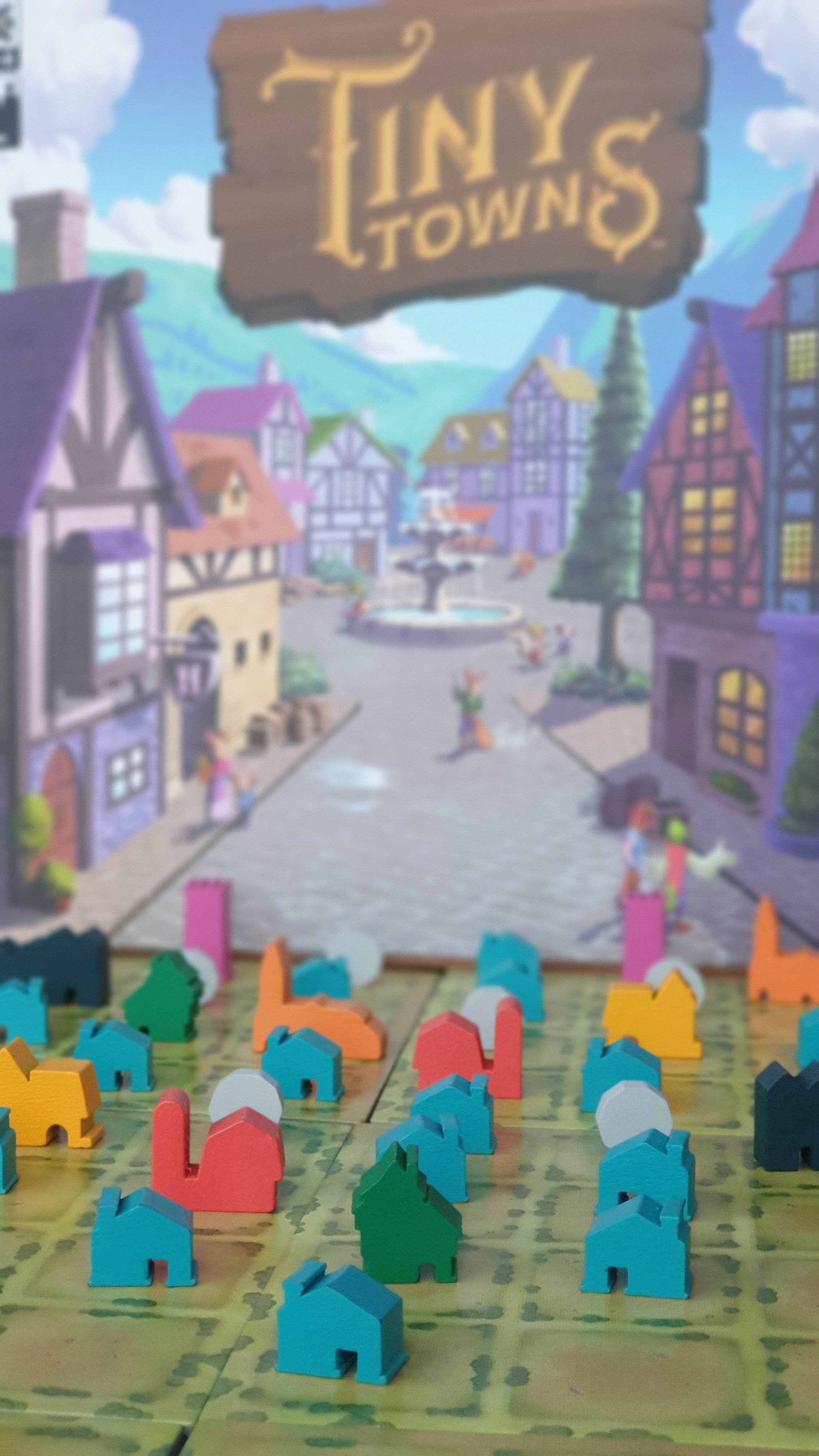 Tiny Towns to najnowsza gra od AEG, która ma wejść na polski rynek dzięki All In Games (ploteczki!). Jest to pozycja dla początkujących graczy ale też dla tych, którzy lubią kombinować.W Tiny Towns bawimy się w prezydenta wioski, który zbiera zasoby i rozwozi je po terenie budowy, próbując zbudować jak najlepsze miasteczko.Podczas gry będziemy dobierać kostki reprezentujące drewno, zboże, szkło, cegły i kamienie, i układać je w pożądane kształty pokazane na kartach. Kiedy kostki spełniają warunki, konstruujemy dany budynek na jednym z pól, na których znajdowały się zasoby. Gra kończy się, gdy żaden z graczy nie może wykonać ruchu.