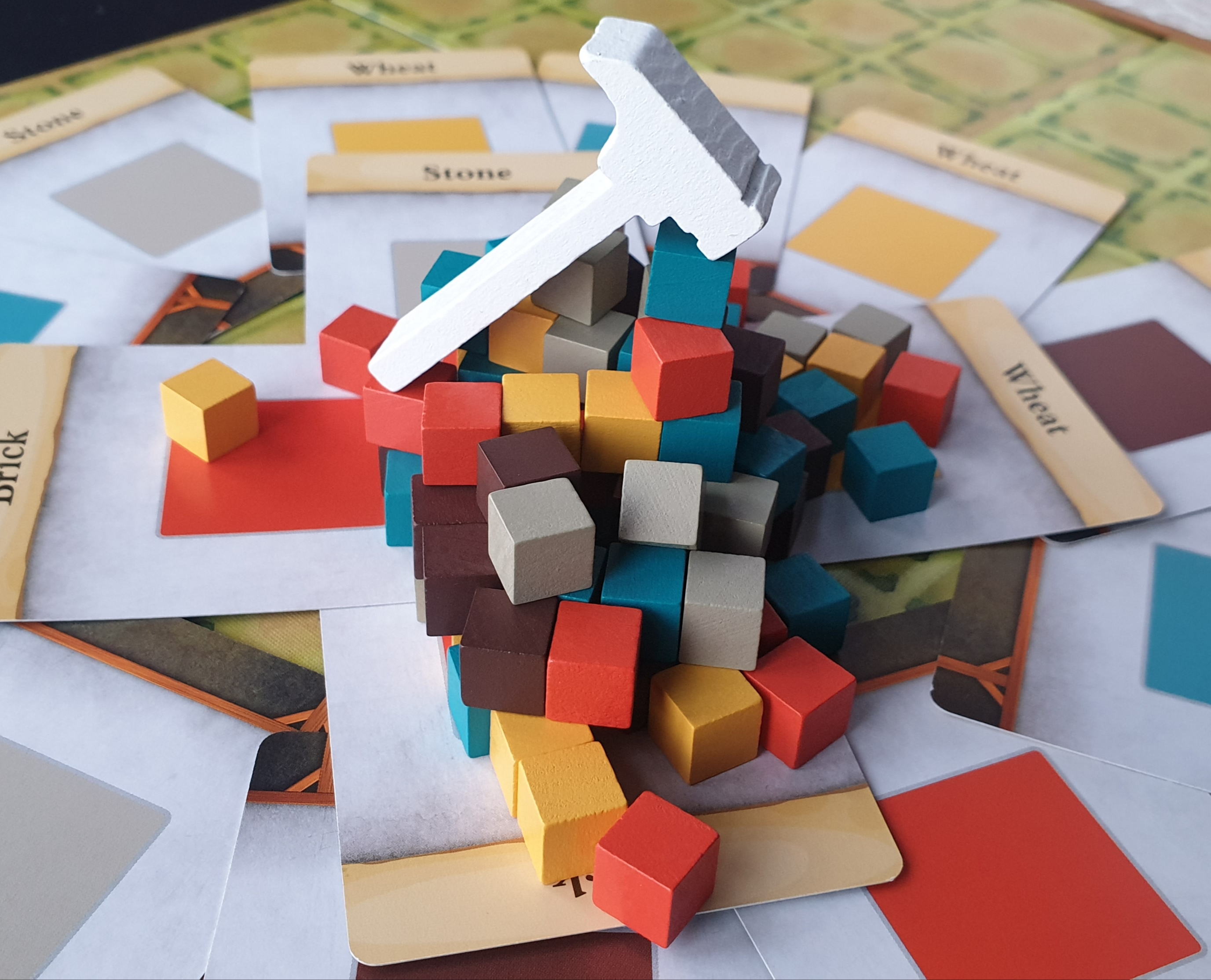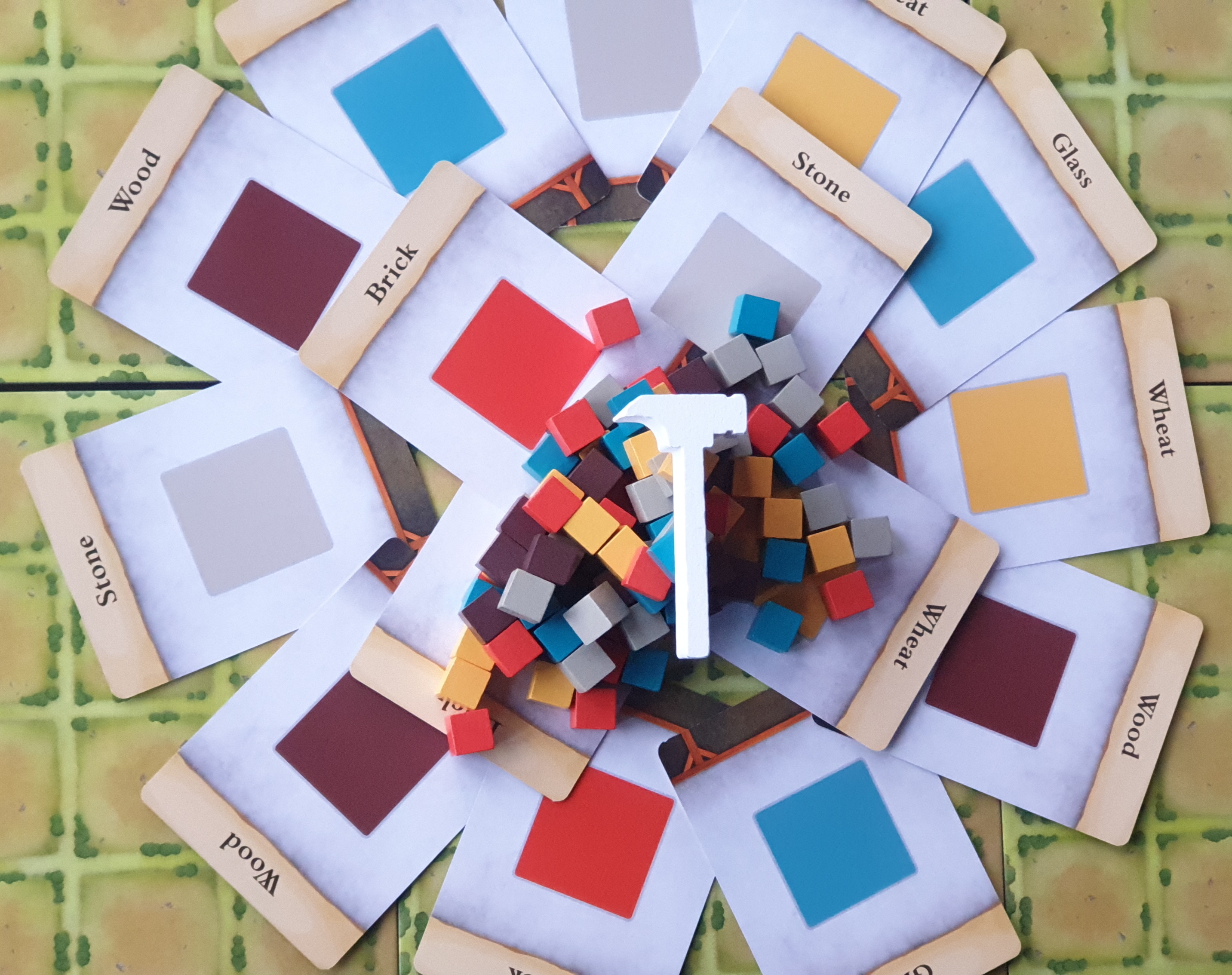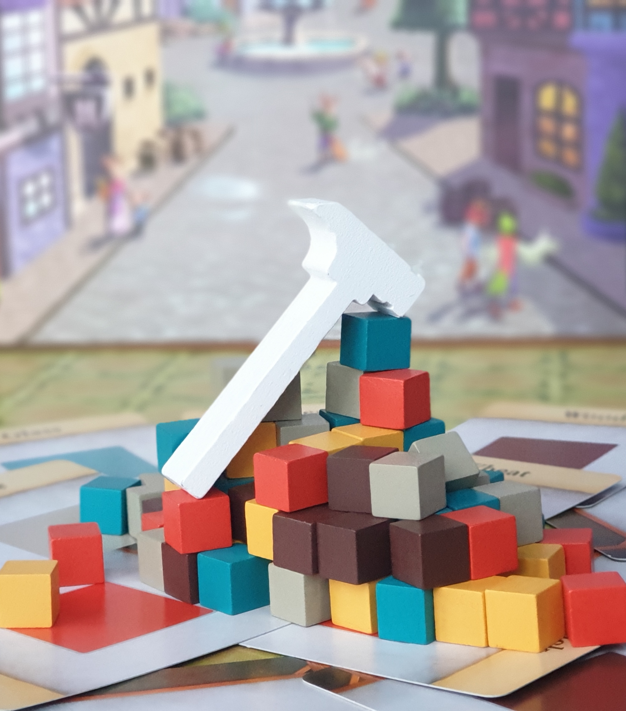 Budujemy miasteczko, czyli rozporządzamy surowcami, planujemy gdzie je dostarczyć w celu skonstruowania różnych budynków. Gra jest dość mechaniczna jeśli skupimy się na kolorach kostek, jeśli natomiast będziemy nazywać zasoby po imieniu, trochę bardziej się wczuwamy w rolę. Nie doszukiwałabym się głębi w tej grze, jest ona prosta z lekkim powiewem motywu budownictwa. Jeśli gramy w wersję 'przyjazną’ to używamy kart, które dają nam dwa losowe zasoby i jeden naszego wyboru. W 'pełnej’ wersji gry każdy ma szansę wybrać zasób, ale jest on również narzucony innym.