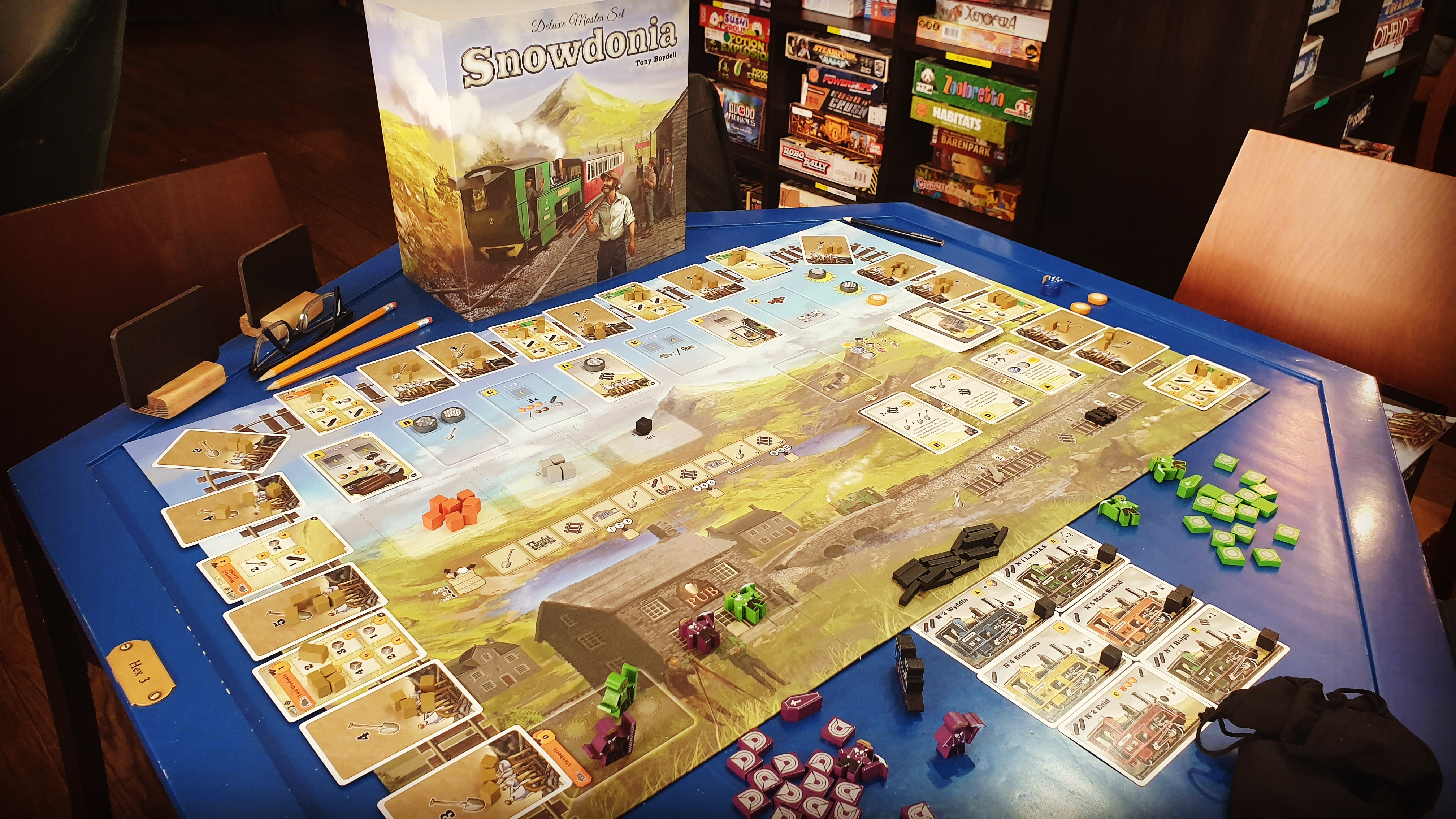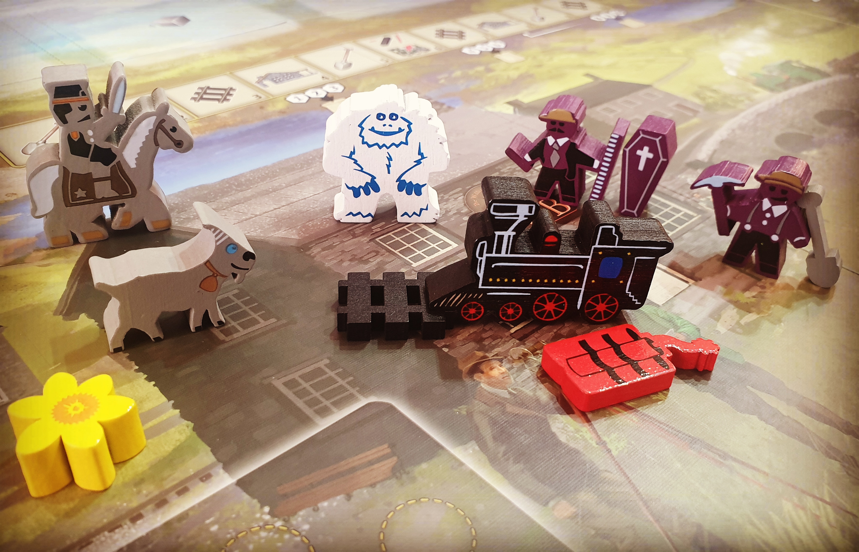 Na początku rzuca się nam w oczy wielka plansza, naprawdę duża, większa niż Scythe, This War of Mine, Eldritch Horror czy Teotihuacan. Ale tak naprawdę 90% gry dzieje się właśnie na planszy. My musimy mieć wystarczająco dużo miejsca na kilka, może kilkanaście kart. W wersji Deluxe komponenty są cudne, różnokształtne meple z nadrukiem, żetony torów, łopaty, pociągu (dodatkowo trumien, kóz i Yeti). W wersji podstawowej to kostki i pionki. Plansza jest dwustronna, z prostą ale przyjemną dla oka grafiką z górą Snowdon w tle, oraz pubem na pierwszym planie.